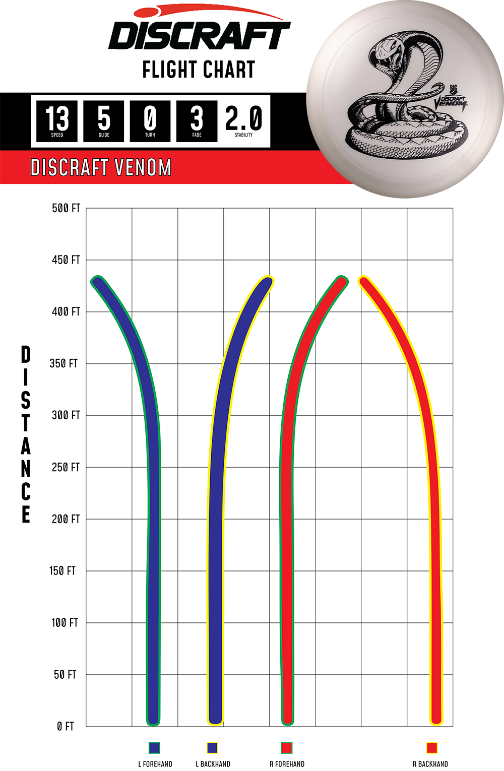 The Venom is an extremely fast, overstable driver that works well for forehands, backhands, and even overhand throws. This disc fights the wind extremely well and doesn’t have a ton of glide, so it tends to get to the ground more quickly.