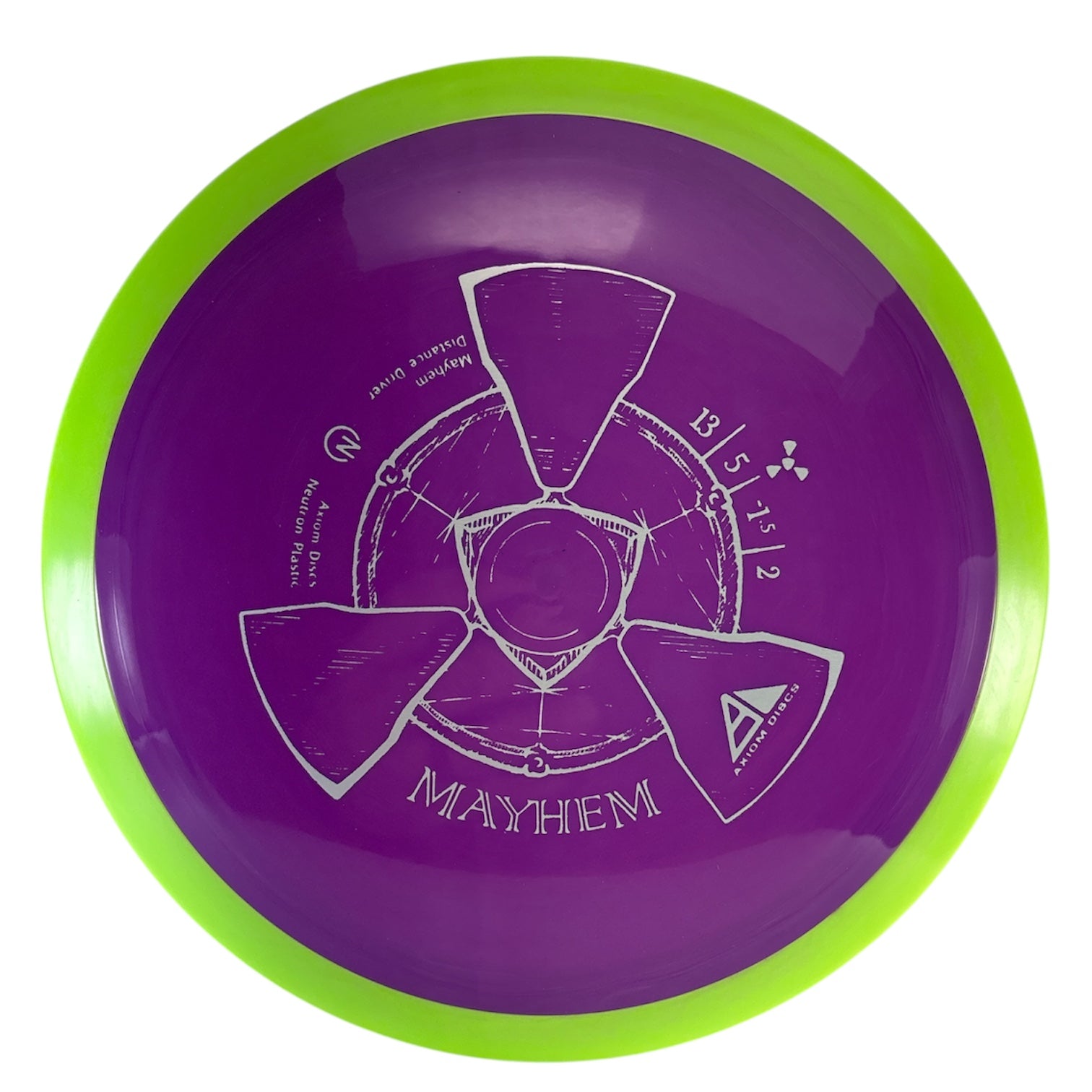 Mayhem has a responsive straight-stable profile and plenty of speed, making it a perfect workhorse driver for many advanced and expert throwers. Like the MVP 23mm class, the Mayhem has a pronounced dome to promote distance-covering glide. Mayhem is best compared to a beat MVP Octane.