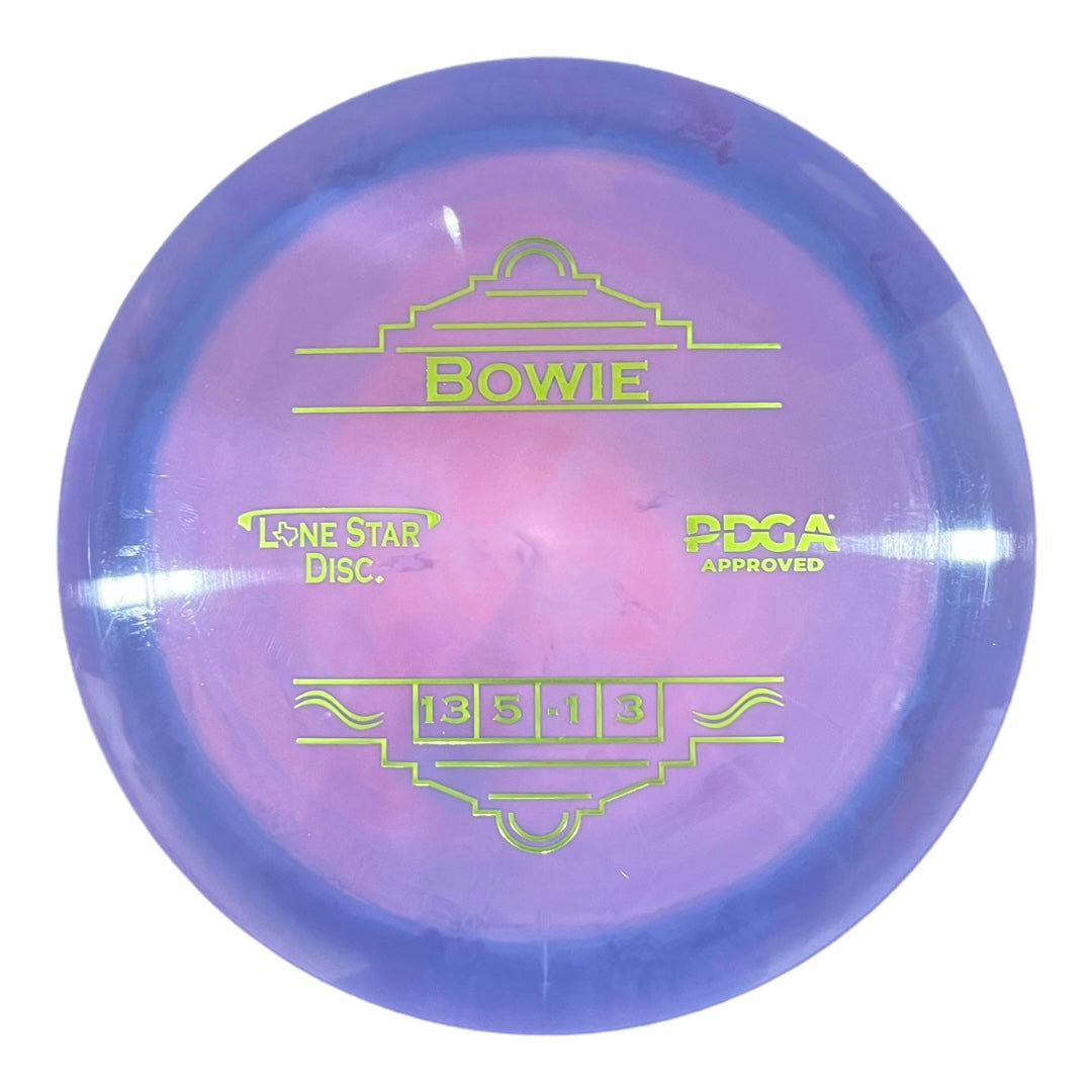 The Bowie is Lone Star's first distance driver. This is a fast overstable disc, designed to handle power. It will fly very straight with a little turn and a nice fade at the end. This is a great disc for power throwers, windy shots, forehand throws, and strategic doglegs.