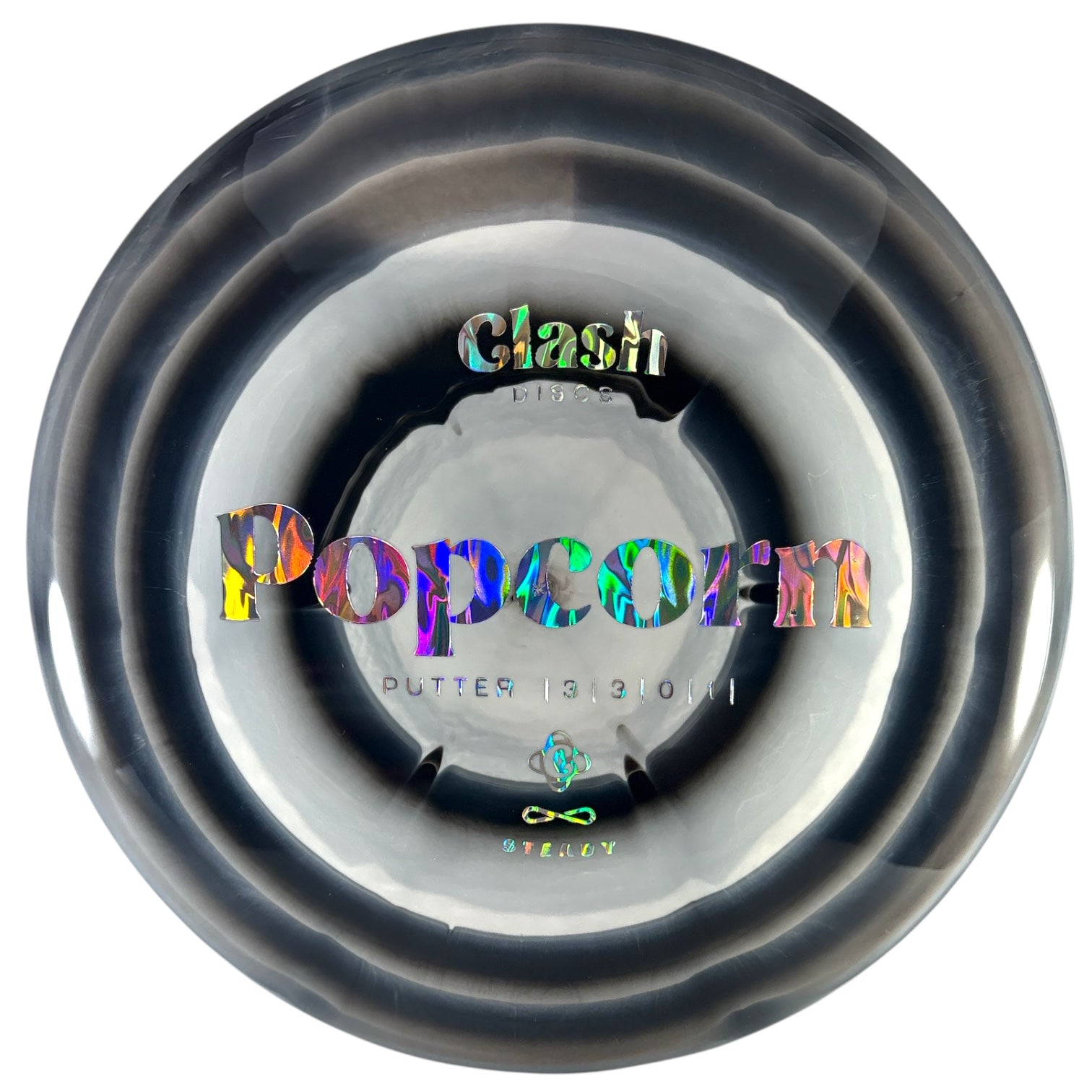 The Clash Discs Popcorn is a straight flying putter. This salty straight putter provides a controllable approach disc that can hold a large variety of lines. This putter can find a spot in your bag as a workhorse of a throwing putter and even a putting putter.