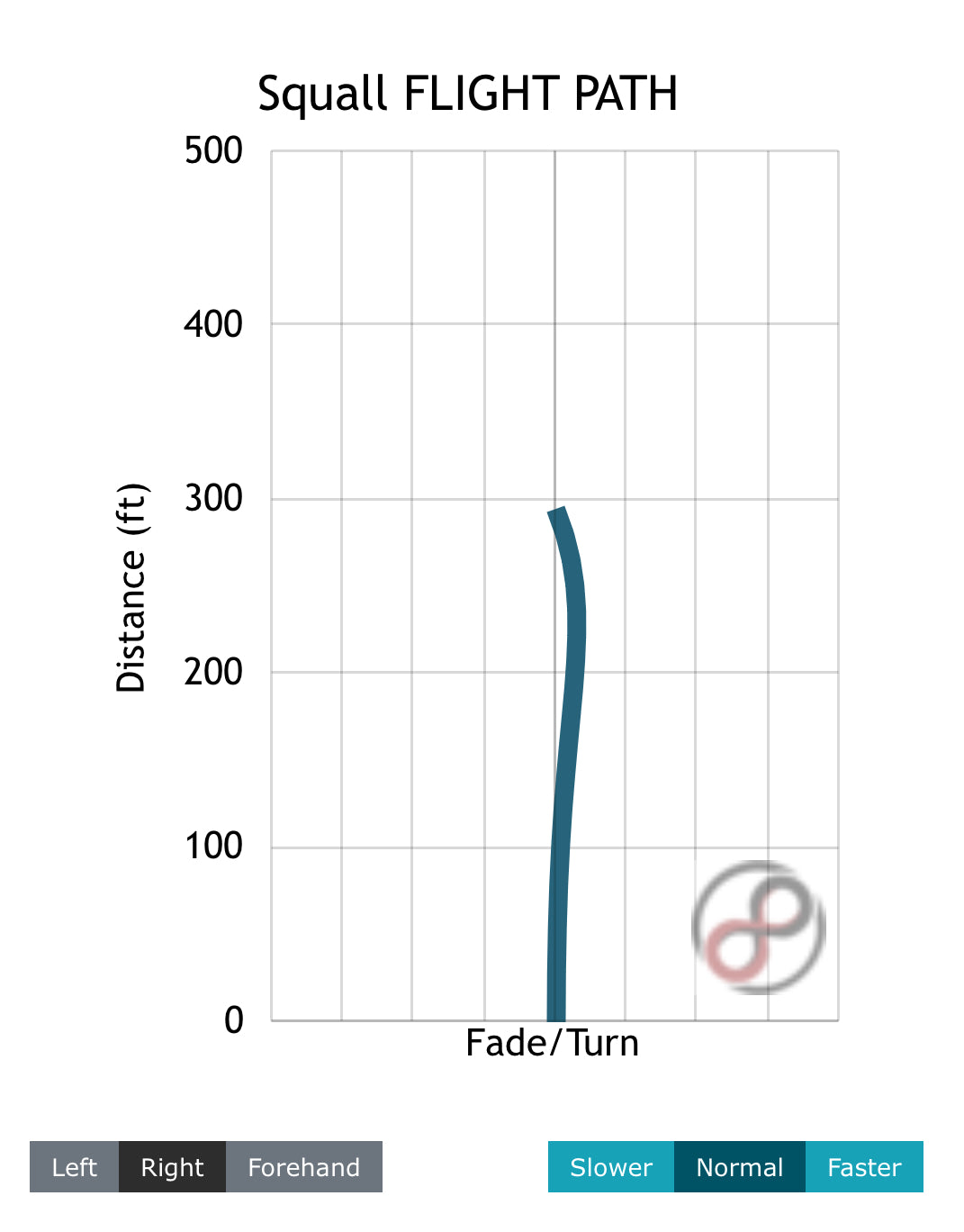 For a solid throw with a bit of personality to its flight, the Squall by DGA fits the bill. This disc has a smooth flight with a hint of turn and slightly stronger fade before it sits down. The disc has an average to thin sized rim, and has a great feel for making a nice midrange or approach shot.