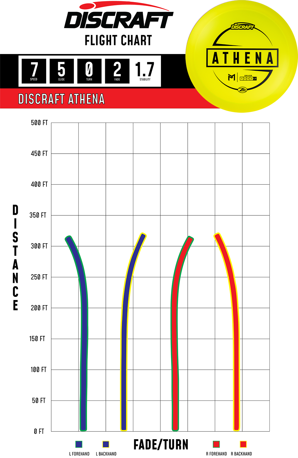 The Athena is the sixth disc in the Paul McBeth line from Discraft. It is an all-purpose fairway driver with a light end-fade. The Athena can be used when distance is not as important as landing with excellent control.