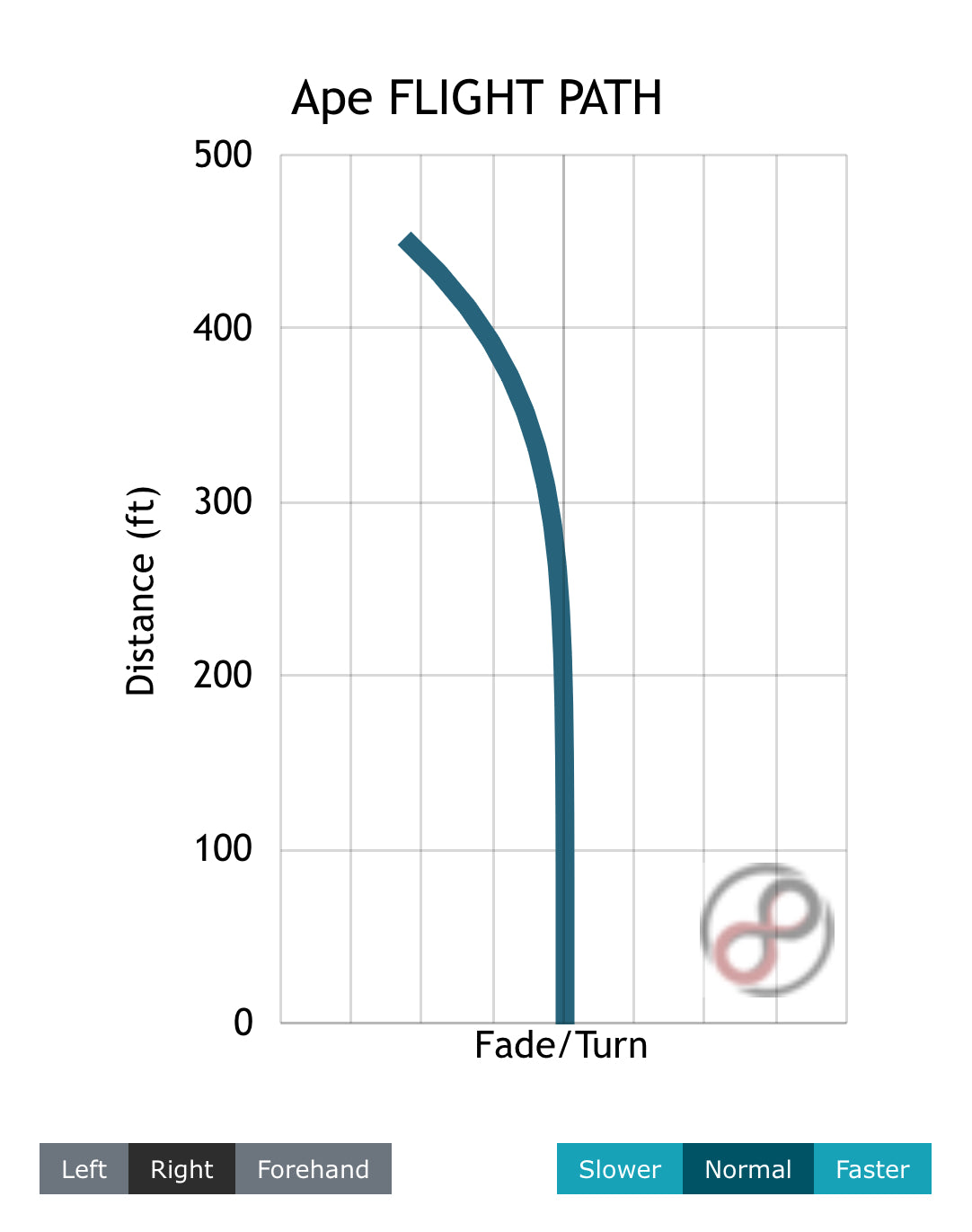 As a super-overstable high-speed driver, the Innova Ape isn’t made for everyone. Unless you can drive more than 400 feet, this won’t provide maximum distance for backhand throws. The Ape is designed for ultra power throwers, headwind shots, and strategic dog-leg fades. As a power driver, it is available in Star and the durable Champion plastic, in weights from 173-175 grams. This disc is also available in lighter weights in the Blizzard Champion plastic between 130-159g. The lighter weight Blizzard Ape is more suitable for players who can’t throw with ape-like force. This is one of our best selling Blizzard plastic discs.