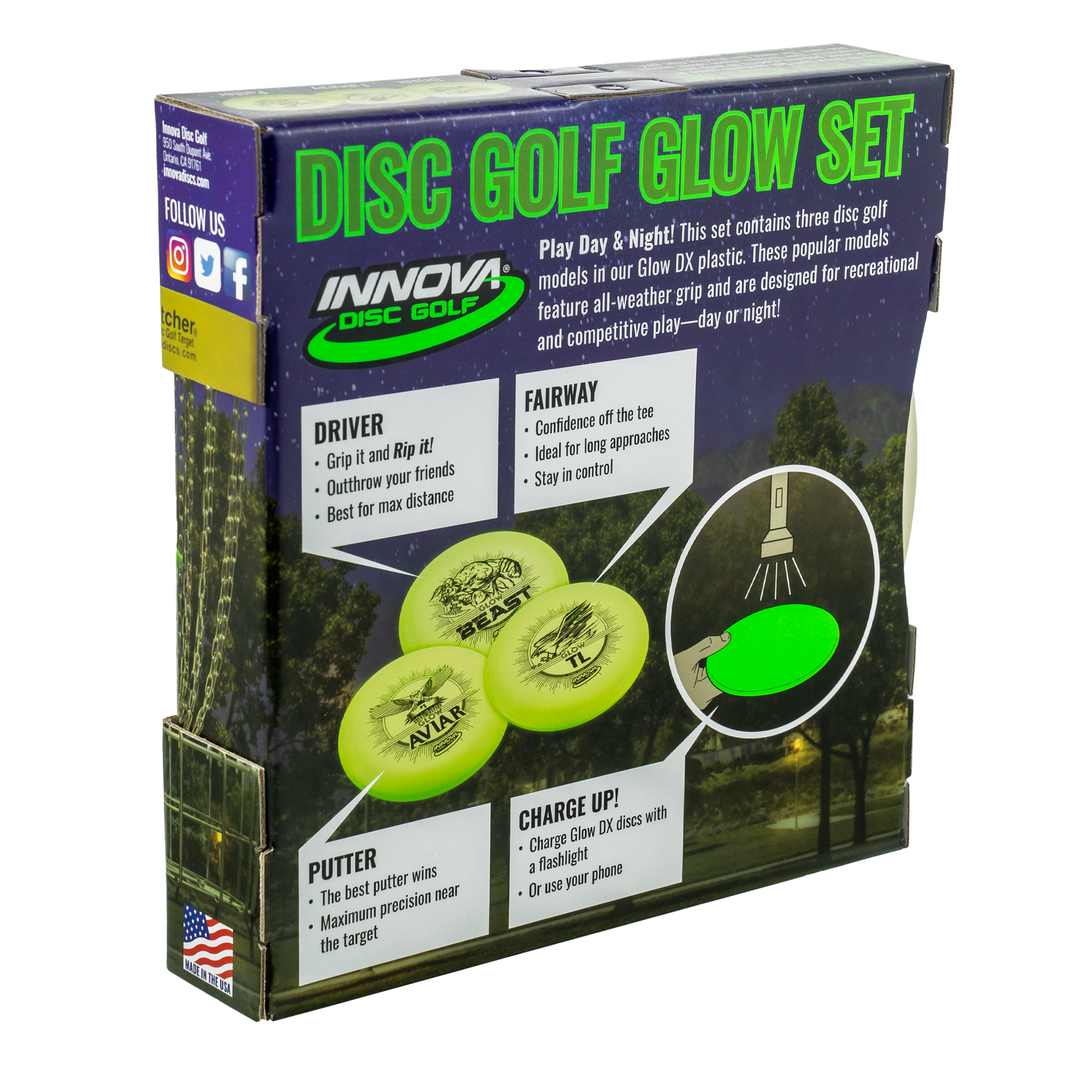 Our Innova 3-Disc Glow Set has everything you need to shine during your glow rounds this fall. This versatile pack comes with a DX Glow Aviar Putter, a DX Glow TL Fairway Driver, and a DX Glow Beast Distance Driver, preparing you for holes of any length and shape. Glow disc golf is more than just a great way to keep playing through the late fall and winter; it is an exciting twist that can make an entirely new experience out of a course that you have played countless times.