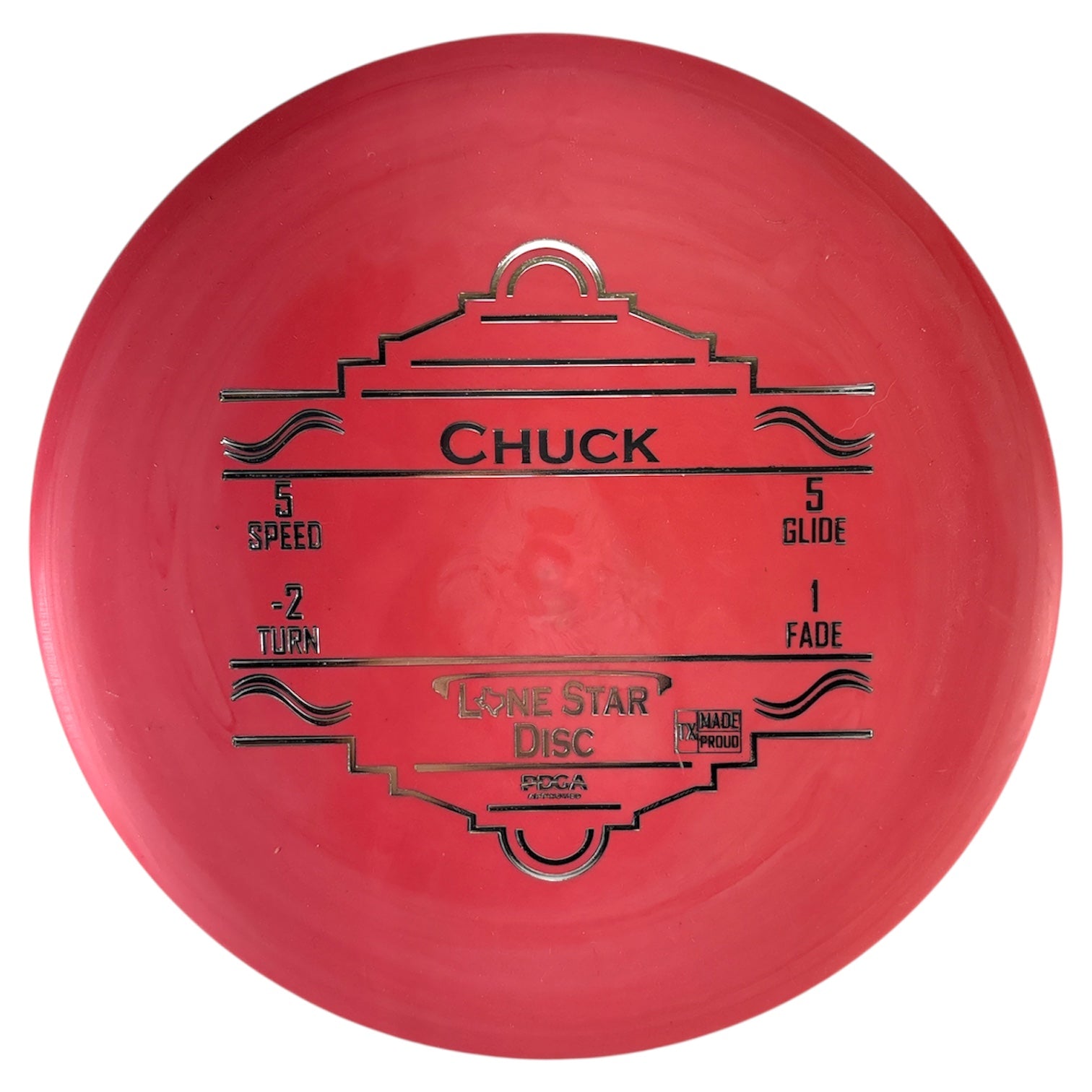The Chuck by Lone Star Disc is a semi-understable midrange with a controllable turn and a gentle fade. It is great for straight throws and hyzer flips.