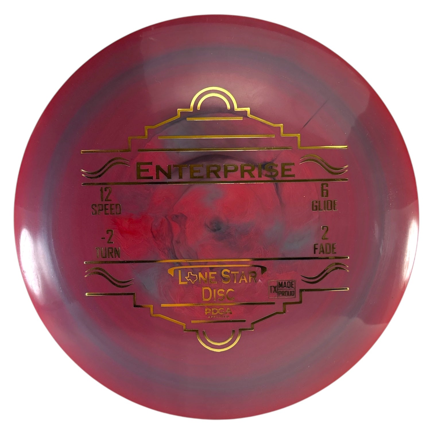 The Enterprise by Lone Star Disc is a neutral 12-speed distance driver with nice turn and equal end-fade. It is a great all-purpose distance driver for the masses, reaching respectable distances without too much turn or too much fade.