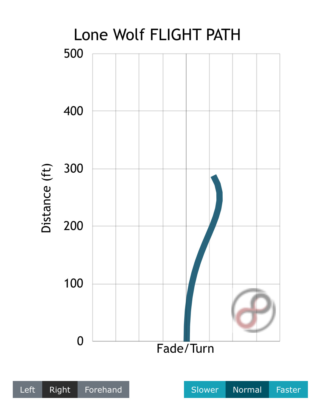The Lone Wolf, by Lone Star Disc, is a fairway driver / midrange crossover disc with a more aerodynamic profile than most mids. It is understable with plenty of turn to hold anhyzer lines and is also a great choice for new players who want to avoid a premature fade.