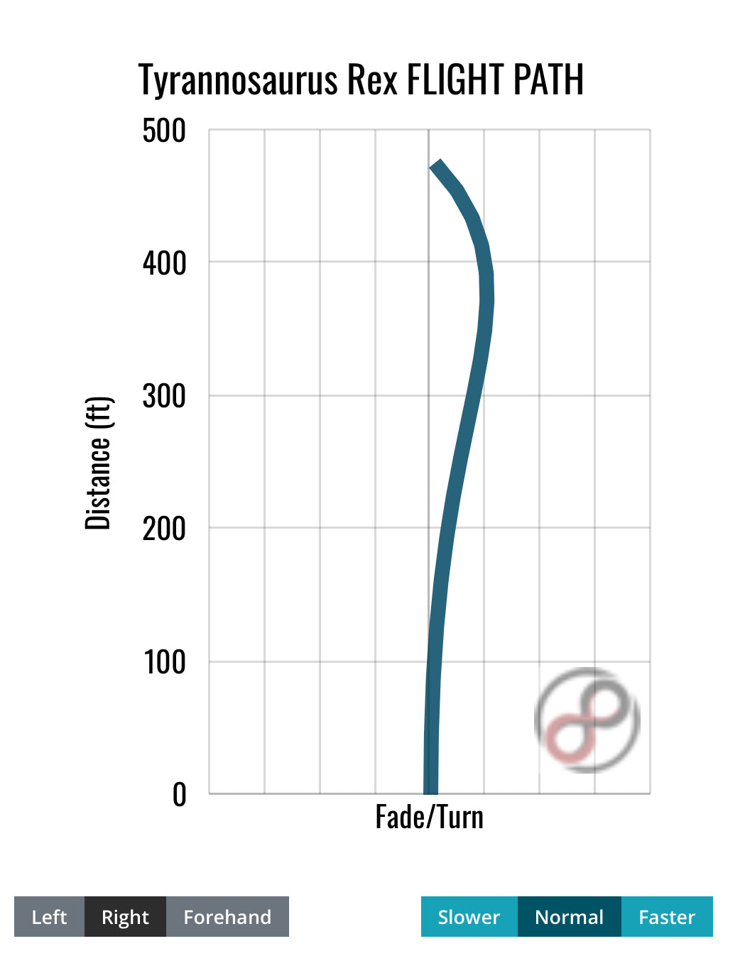 The Tyrannosaurus Rex was the king of the carnivorous dinosaurs, so it is only fitting that the disc should be the fastest in the Dino Discs line-up. This is a maximum distance driver with a wide rim. So, even though it is very lightweight, it might be more difficult for very small children to get it up to speed. But once a player gets their technique figured out and they want to try to let loose a long-bomb drive at maximum speed, this is the disc to unleash!