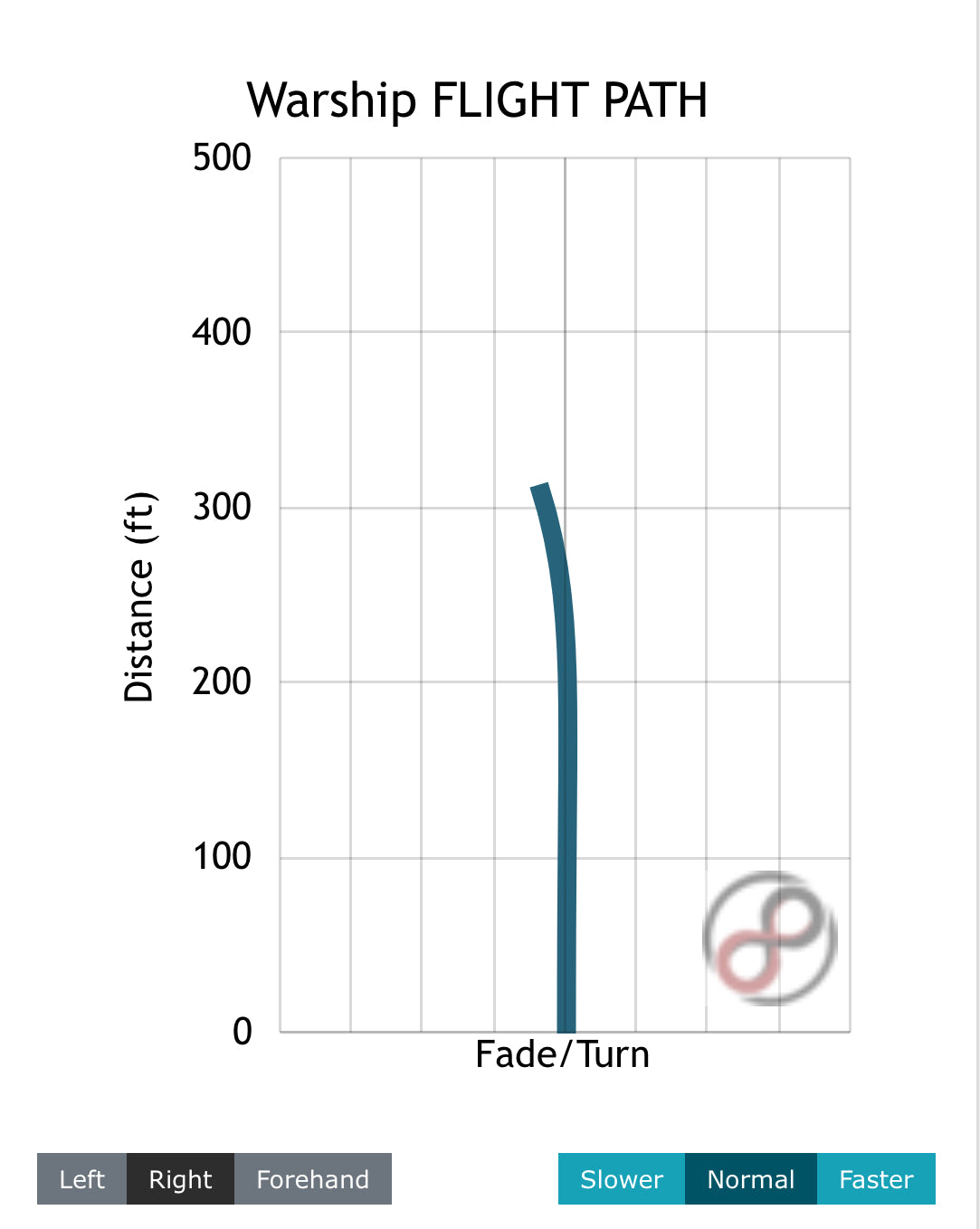 The Warship is our answer to the everyday player's need for a midrange. Designed to be user-friendly for all levels, it holds a straight line and feels great in the hand. For faster arm speeds, it will fly straight and be very controllable. For lower arm speeds, it will hold a straight line and finish to the left for right-handed players and right for left-handed players. The Westside Warship has great glide and flight, and it is the fastest midrange in our line.